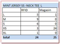Although the total item counts were close to accurate, the accuracy for style, sizes and colors were not actually close to reality. If there was a pile of clothes, the inventory control person would normally count only the top item, so if the size was different below, a variance in inventory would be created. The example (pictured right) demonstrates this. (Please note, "Magasin" is French for "Store".)